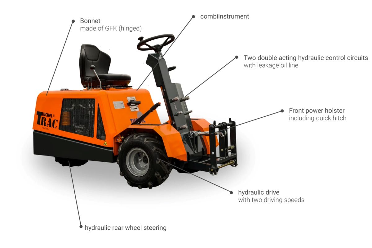 Tuchel-Trac Trio ir radīts profesionāļiem: ainavu veidotājiem, lauksaimniekiem, pašvaldību dienestiem un būvniecības speciālistiem. Divas jaudīgas hidraulikas ķēdes ļauj ātri pievienot un mainīt darba rīkus, padarot šo transportlīdzekli par īstu universālu palīgu.