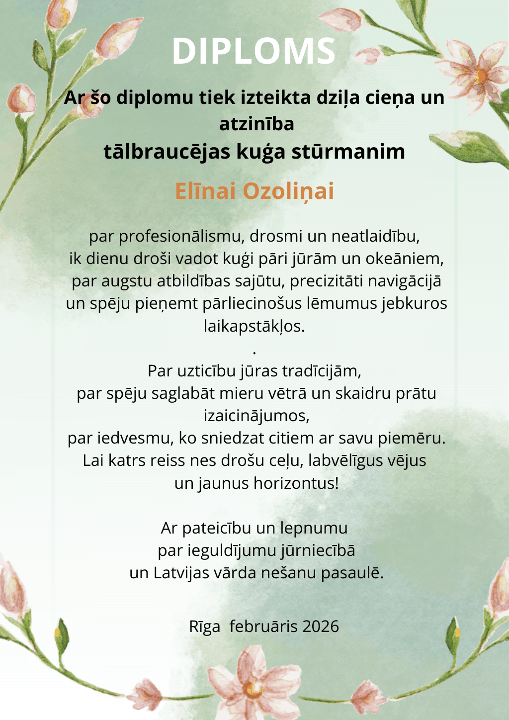 Atzinības Diploms tālbraucējas kuģa stūrmanim