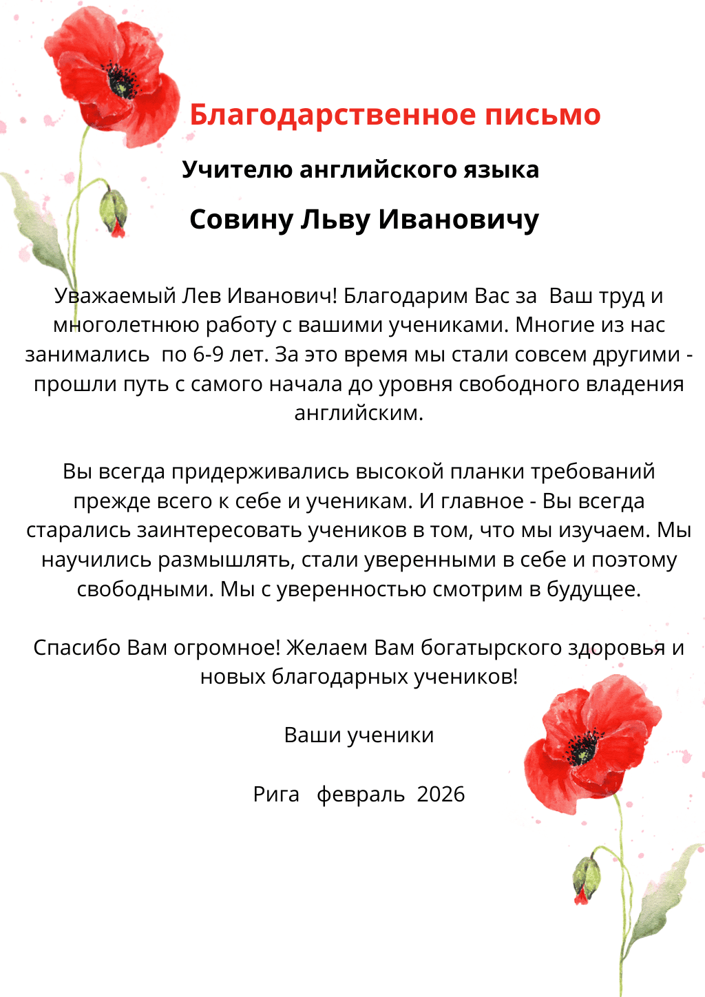 Благодарственное письмо учителю английского Совину Льву Ивановичу