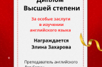 Элина Захарова учится в 7 классе. Занимается на курсах английского в центре SOVINS со 2 класса, то есть учится шестой год. В этом учебном году добилась блестящих результатов. Ее ответы и оценки на каждом уроке 10 баллов. Портал Rilsoa поздравляет Елину Захарову с таким выдающимся результатом и с присуждением Диплома Высшей Степени за особые заслуги в изучении английского языка